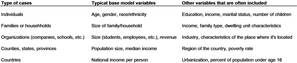 9.1. The base model Compared to the models used so far in this book, models like those reported in Figure 8-16 and 9-2 have a large number of independent variables. Most regression models used by social scientists include many independent variables, from 6 or 8 up to sometimes 20 or more. When models include so many variables, it is necessary to have some way to organize them. A good place to start is with a base model. Base models are initial models that include all of the background independent variables in an analysis that are not of particular theoretical interest for a regression analysis. For example, in studying the relationship between social status and trust in society, variables like gender, age, town size, and all the other variables included in Model 1 of Figure 9-2 are not of particular theoretical interest. They are only included in order to control for the backgrounds of the people in the study. Model 1 would be considered a base model for Figure 9.2. The kinds of variables that are typically used in base models for different kinds of data are summarized in Figure 9-3. The variables to be included in a base model often depend simply on what data are available. For databases where the cases are individuals, many different variables are usually available. As you move up the chain to larger and larger units, less and less data are available, and so fewer and fewer base model variables tend to be included. For models comparing countries, the one variable that is almost always included is national income per person. The inclusion of national income in regression analysis helps adjust for the fact that rich countries like the United States and Japan are different in almost every way from poor countries like Cambodia and Haiti. If a researcher using cross-national data didn't control for national income, people who disagrees with the researcher's views would almost certainly raise this as a major criticism of the researcher's regression models.