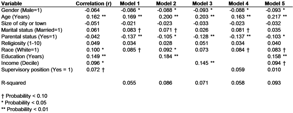 Model 1 includes all the background factors together in a single regression model. Interestingly, marriage and parenting seem to complement each other. Neither marital status nor parental status is significantly correlated with trust in society, but in the regression model both variables are significant when controlling for the other. Model 2 also includes all of the background factors, but adds education, which is highly significantly related to trust in society. In Model 3, income is found to be highly significantly related to trust in society, but in Model 4 the effect of holding a supervisory position at work is non-significant. In the final model, Model 5, the only social status variable that has a highly significant coefficient is education. The fact that the coefficients of all three social status variables are smaller in Model 5 than in the other models indicates that these three variables compete with each other in explaining trust in society. This would be expected, since they are all different ways of operationalizing the same concept. People who are highly educated tend to have high incomes and supervise other people at work, while people who are poorly educated tend to have low incomes and not supervise other people at work. Since the (standardized) coefficient for education in Model 5 is much larger than the (standardized) coefficients for income and supervisory position, we can conclude that education is the most important of the three social status determinants of trust in society. Which of the five models is the best model for explaining how social status affects trust in society? That depends on just what it is that the researcher wants to know about the effects of social status. All of the models add information that might be useful. A fuller picture of the determinants of trust in society can be developed using all five models than from any one of the models by itself.