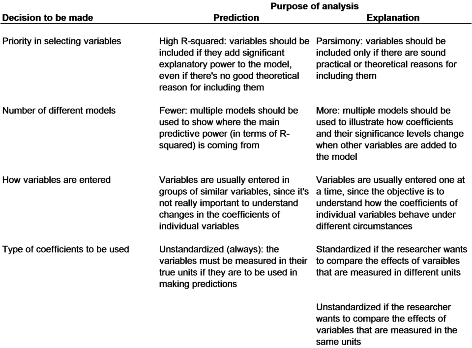 9.2. Explanatory versus predictive models In between the base model and the saturated model, there are no real rules about what variables should be included in regression models or in what order. A common approach is to do what's been done in Figure 9-2: start with the base model, then add the independent variables of interest one at a time in separate models, then report a saturated model in which all of the independent variables are used at the same time. When models are designed to evaluate the relative strengths of different explanations of the dependent variable, the independent variables have to be entered one at a time in separate models. This makes it possible to compare how well each of them explains the dependent variable. Explanatory models are regression models that are primarily intended to be used for evaluating different theories for explaining the differences between cases in their values of the dependent variable. On the other hand, sometimes the objective of a regression analysis is simply to predict the values of a dependent variable, without any interest in the theoretical implications of the models. Predictive models are regression models that are primarily intended to be used for making predictions about dependent variables as outcomes. For example, in Figure 3-9 a very simple predictive model was used to predict levels of soft drink consumption in the US states of Alaska and Hawaii. In predictive models, it is less important to understand how the coefficients of variables change between models or to control for potentially confounding variables. All that really matters is getting a high R2 score, since R2 indicates the proportion of the total variability in the dependent variable that is accounted for by the model. In general, models with higher R2 scores make more accurate predictions of the dependent variable. Some of the key differences between explanatory models and predictive models are laid out in Figure 9-4. A major difference is the way that independent variables are selected for inclusion in each model type. The main objective of an explanatory model is to make inferences about the effects of different independent variables on the dependent variable. Independent variables are carefully selected for inclusion based on specific theoretical reasons, and unimportant or irrelevant variables are never included. Keeping the number of independent variables to a minimum also makes it easier to understand the role each one plays in explaining the dependent variable. In other words, explanatory models place a premium on parsimony. Parsimony is the virtue of using simple models that are easy to understand and interpret. A good explanatory model is one that sheds light on relationships that are of theoretical interest. In contrast, predictive models often take much more of a wild-west, anything-goes approach. So long as the independent variables are correlated with the dependent variable, they help in making predictions. A bizarre example of this is the use of sewage treatment flows in so-called "toilet flush models" of hotel occupancy rates. In beach resort areas, city managers want to know how many visitors they have over a major holiday weekend, but there is no single database that includes a list of all the people who stay in a city's hotels, in private rentals, or visiting friends and relatives. Instead, city managers use the amount of sewage flowing through their sewage treatment plants over the weekend to estimate the number of people who must have been in the city. There's no theoretical sense in which sewage causes people to visit a city, but sewage is a very good predictor of the number of people who actually have visited.