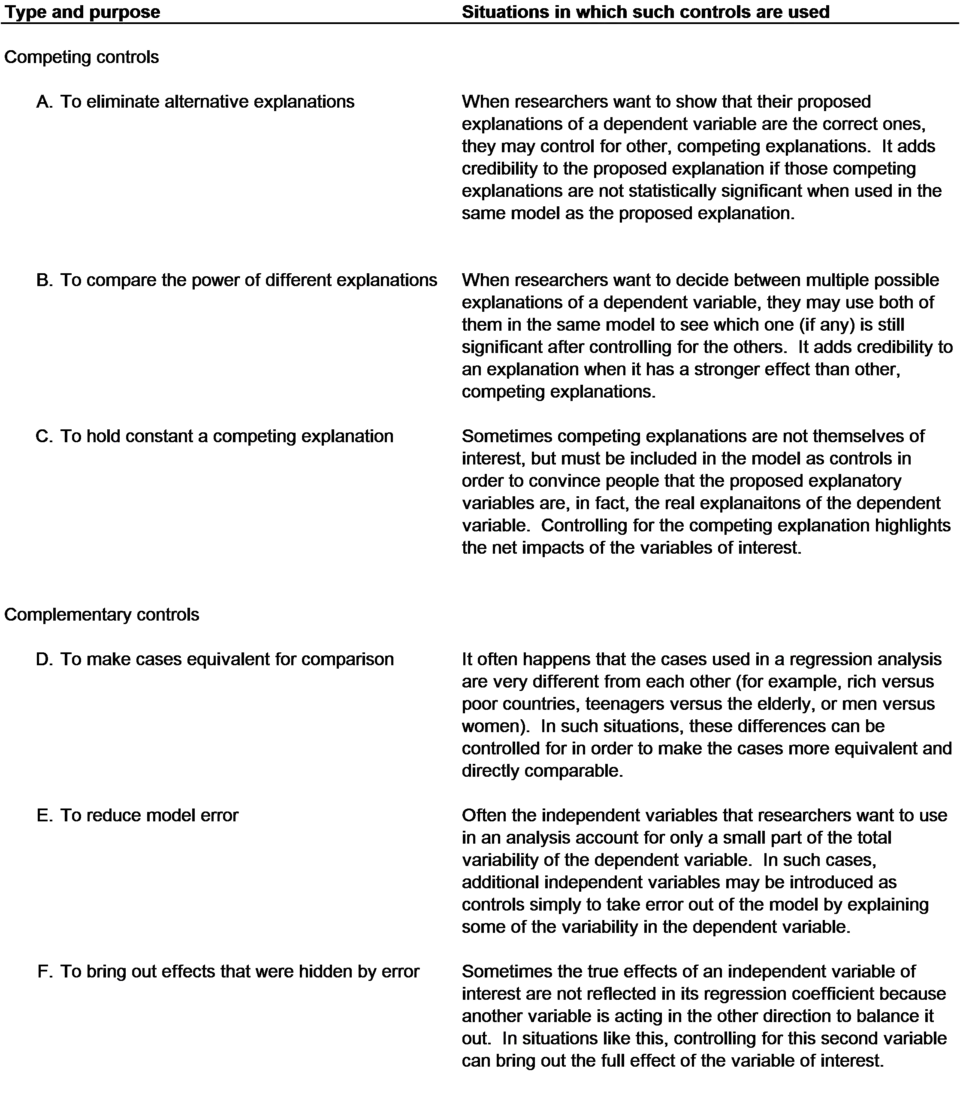 9.3. Reasons for controlling in explanatory models A major challenge in designing regression models is deciding just what to control for. In predictive models, the decision is easy: if a variable is available for use and it helps predict the dependent variable, use it. In explanatory models, the decision is much harder. There are at least six reasons why control variables might be used in an explanatory model, though others are possible as well. They are: A. To eliminate alternative explanations B. To compare the power of different explanations C. To hold constant a competing explanation D. To make cases equivalent for comparison E. To reduce model error F. To bring out effects that were hidden by error The first three reasons (A-C) mainly apply in cases where the control variable tends to compete with other independent variables in explaining the dependent variable. In such cases, the use of the control variable tends to reduce the size and statistical significance of the effects of the other independent variables. The last three reasons (D-F) mainly apply in cases where the control variable tends to complement the other independent variables. In such cases, the use of the control variable can actually increase the size and significance of the effects of the other independent variables. The six reasons and explanations of the kinds of situations in which they are used are summarized in Figure 9-5.