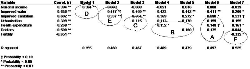All six reasons for using control variables can be illustrated using a series of regression models that are designed to shed light on the reasons why some countries are more successful than others at immunizing their children against common infections. Though there are some controversies surrounding its use, the combined diphtheria-pertussis-tetanus (DPT) vaccine is widely used around the world to immunize infants between 12 and 23 months old against three potentially deadly childhood diseases. The World Health Organization and most national health authorities have official DPT immunization programs. Nonetheless, DPT immunization rates vary from under 40% in some of the poorest countries of Africa to over 98% in many of the middle-income countries of the middle east and eastern Europe. The DPT immunization rate is not a major policy issue in rich countries, both because immunization rates are usually over 90% and because the three diseases -- diphtheria, pertussis, and tetanus -- are not generally life threatening in countries with good medical systems. On the other hand, in poor countries DPT immunization can literally be a matter of life and death for young children. From a policy standpoint, we would like to understand why DPT immunization programs are more successful in some countries than in others, especially in poor countries. Several explanations are possible. First, in many rich countries DPT immunization rates fall well below their potential because of parental concerns about the safety of vaccines, combined with the fact that these diseases are now so rare that most people no longer fear them. Parental fear of vaccines is difficult to measure, but (with a few exceptions) it doesn't seem to be a major factor in most poor countries. It would be useful to study the effects of parental fear across countries, but the data simply aren't available. Other explanations include countries' levels of development, how easy it is to reach infants who need to be immunized, the amount that countries spend on health, the number of trained medical personnel in a country who could give immunizations, and the number of children to be immunized. Specific variables that might be used to operationalize each of these explanations are: Level of development National income -- national income per person ('000s of US Dollars) Improved water -- percentage of the population with "improved" water supply (e.g., a well) Improved sanitation -- percentage of the population with "improved" sanitation (e.g., an outhouse) Ease of reach Urbanization -- urban population (percent of the total population) Health spending Health expenditure -- national health expenditure as a percentage of national income Trained personnel Doctors -- number of physicians per 1,000 population Number of children Fertility -- the mean lifetime number of children per woman Other variables could be included, but data for DPT immunization rates plus all seven of these explanatory variables are available in the World Development Indicators for 100 countries representing over 85% of the world's poor countries by population. From a social policy standpoint, we are particularly interested in knowing what can be done to increase the immunization rate. We can't easily make a country richer or more developed, and we can't do much to make children easier to reach or make there be fewer children. On the other hand, we can give countries foreign aid to help them increase their spending on health. We can also seek volunteer doctors to help in administering immunizations. An important policy question is thus: which would be more useful, giving money or finding volunteers? The series of regression models for DPT immunization presented in Figure 9-6 help answer this question. They also illustrate the six reasons for using control variables. The letter for each reason has been attached to its corresponding illustration in the regression table.