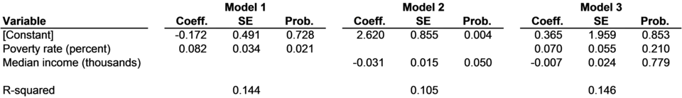 As would be expected, counties that have higher poverty rates also have higher murder rates (Model 1). Every 1% increase in the poverty rate is associated with a 0.082 person increase in the number of people murdered per 100,000 population. That's not a lot, but it is statistically significant (probability = 0.021, which is less than 5%). Also in line with expectations, counties that have higher median incomes have lower murder rates (Model 2). Every $1000 increase in median income is associated with a 0.031 person decline in the number of people murdered per 100,000 population. Again, the relationship is small but (just) statistically significant (probability - 0.050, or 5%). In Model 3, however, neither poverty nor income is significantly related to the murder rate. Both variables have non-significant coefficients. A researcher who only looked at Model 3 without running models like Model 1 and Model 2 that examined the effect of each variable individually might conclude that neither poverty nor income was significantly related to murder rates. This error is called the "partialling fallacy." The partialling fallacy is a false conclusion that independent variables are not related to the dependent variable when, in fact, they are. The partialling fallacy label applies only in those situations where the variables partialling each other are meant to operationalize the same concept. There are at least three ways around the partialling fallacy. The simplest is to pick just one operationalization of the concept and ignore any others. A better approach is to combine the multiple operationalizations of the concept into a single variable. At the most sophisticated level, multiple operationalizations of a concept can be used together in a model and their joint power to explain the dependent variable studied through their collective impact on the model's R2 score. Notice how the R2 score in Model 3 is slightly higher than that from Model 1 (0.146 versus 0.144). This indicates that poverty and income together explain slightly more of the cross-city variation in murder rates than does poverty alone. The joint analysis of R2 scores has the advantage that it allows the researcher to use all of the available data in all its complexity. On the other hand, complexity is also its main drawback. Sometimes joint analysis adds value, but most times it makes more sense just to keep things simple. Model 1 explains nearly as much of the variability in murder rates as Model 3, without the distraction of managing multiple variables. It would be a reasonable compromise to study city murder rates based on city poverty levels, without worrying about median income.