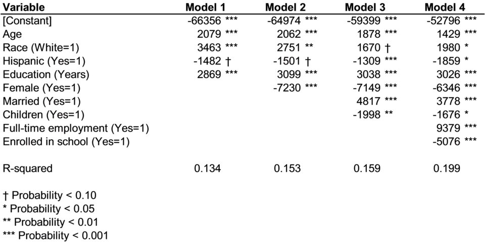 Model 1 is a base model that includes four background variables: the respondent's age, race, Hispanic status, and years of education. As expected, people have higher incomes when they are older, white versus black, non-Hispanic, and more educated. In Model 2, the coefficient of -7230 indicates that, on average, twentysomething women earn $7,230 less per year than twentysomething men, even after controlling for age, race, Hispanic status, and years of education. Model 3 adds two family variables, marriage and children. Married people earn more than single people and people with children earn less than people without children. These two variables remove some error from the model, but they have very little effect on the gender gap. The possibility that women make less than men because of family obligations can safely be discarded as a competing explanation for women's lower wages. The final, saturated model (Model 4) adds two labor market variables: whether or not people work full-time and whether or not they are attending school (which might mean that they're not working to full potential). Controlling for these competing explanations does reduce the gender gap, but only by $803, from $7,149 to $6,346. These competing explanations both have highly significant coefficients and seem to be important determinants of wages, but they do not explain the majority of the wage differences between women and men. Though the gender gap may not be due to discrimination, we can conclude from the models presented in Figure 9-8 that it probably isn't caused by family factors or labor market factors. Incidentally, it is impossible for any of the variables in Figure 9-8 to be confounded with gender because gender is determined randomly at the time of conception, but there may be other confounded effects. For example, it is possible that older people are more educated (since the youngest people in the sample would not have finished their educations by the time of the study) and earn higher wages, so education is likely to be confounded with age. This might be a problem if the purpose of the analysis was to understand the relationship between education and income, but age and education are used here only with the intent of making cases equivalent for comparison. Similarly, marriage and children may be confounded, but again this is not an issue from the standpoint of the gender gap. The models presented in Figure 9-8 are reasonably parsimonious. Very few variables are included, and all of them have statistically significant effects. A fuller model of twentysomething wages might control for many more variables and still not be considered overly complex. For example, an important alternative explanation of the gender gap in wages is that it might be due to women's choices of what industry to work in. This will be investigated further in Chapter 10.