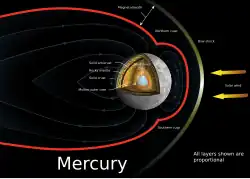 The spacecraft made three close approaches to Mercury, the closest of which took it to within 327 km of the surface.[126] At the first close approach, instruments detected a magnetic field, to the great surprise of planetary geologists—Mercury’s rotation was expected to be much too slow to generate a significant dynamo effect. The second close approach was primarily used for imaging, but at the third approach, extensive magnetic data were obtained. The data revealed that the planet’s magnetic field is much like the Earth’s, which deflects the solar wind around the planet. However, the origin of Mercury’s magnetic field is still the subject of several competing theories.[127]
