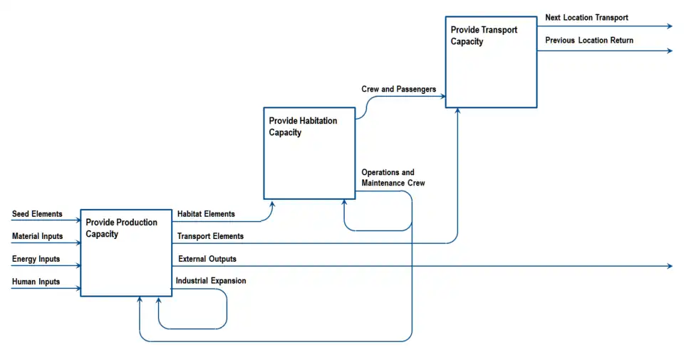 The primary functions within a location include production, habitation, and transport capacities. These allow it to support people at the location, and interact with the rest of civilization. We will develop functional flow diagrams to model these elements and the flows that connect them to each other and outside the program.