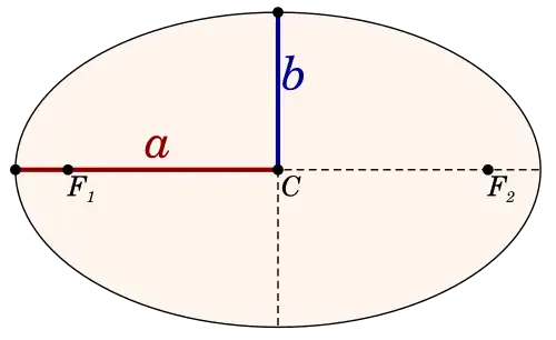 where r is the distance between the orbiting object and the large body of mass M it orbits, and a is half the long axis of the orbit shape, or Semi-major Axis. An orbit may be circular, but most repeating orbits are elliptical to some degree (Figure 1-1). The large body is located at one focus F of the ellipse. When the orbiting object is large enough relative to the larger body, such as the Moon is to the Earth, they both orbit their common Center of Mass. For the Earth and Moon that center is about 3/4 of the way from the Earth's center to the surface in the direction of the Moon.