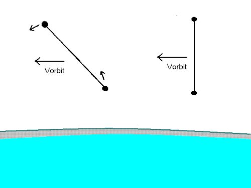 - A variation from vertical cables is the orbital slingshot. This would take advantage of the tendency of a long object to auto-rotate from horizontal to vertical orientation about the center of mass due to "tidal" effects. A relatively light-weight vehicle, launched conventionally, would dock with a much more massive "orbital momentum bank" (largely consisting of discarded rocket stages left at the bank with each launch), and be hooked to a cable reel. The vehicle would be pushed out to a somewhat higher orbit, where it would fall behind the momentum bank, with cable being paid out at a matching rate. After sufficient tether has been paid out, it would be braked to a halt, putting it under tension. The momentum bank would slow and fall inward, while the vehicle would be accelerated and fall outward. It is released at the desired orientation and velocity to transfer to a higher orbit. Unlike an "elevator" system, the tether need not be long enough to continuously reach the ultimate orbit, as the vehicle will be "slung" outward up to 14 times the cable length.