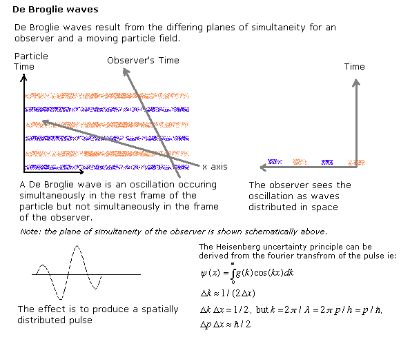 He combined this insight with Einstein's ideas on the quantisation of energy to create the foundations of quantum theory. De Broglie's insight is also a round-about proof of the description of length contraction given above - observers in relative motion have differing three dimensional slices of a four dimensional universe. The existence of matter waves is direct experimental evidence of the relativity of simultaneity.