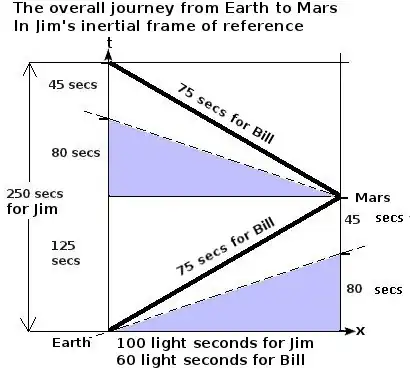 The one way journey would become fully symmetrical if Bill continued past Mars until his clocks read that 125 seconds had elapsed, at this point he would assess that Jim had experienced 75 seconds of elapsed time. When Jim's clock's read 125 seconds Jim finds Bill's clocks read 75 seconds and, symmetrically, when Bill's clocks read 125 seconds Bill finds that Jim's clocks read 75 seconds. This symmetry is emphasised in the schematic diagram below which compares Jim and Bill's clock readings: