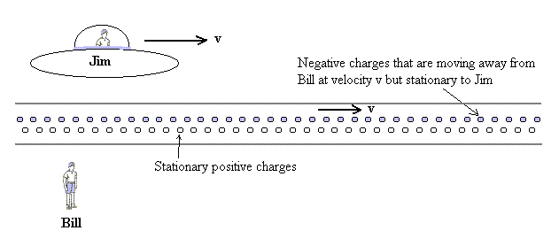If Jim is moving relative to the wire at the same velocity as the negative charges he sees the wire contracted relative to Bill: