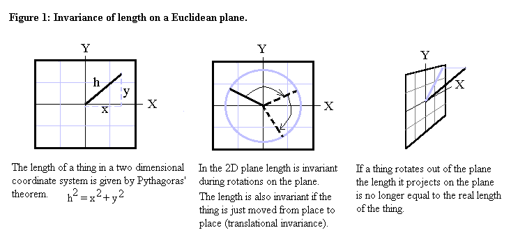 The modern approach uses the concept of invariance to explore the types of coordinate systems that are required to provide a full physical description of the location and extent of things. The modern theory of special relativity begins with the concept of "length". In everyday experience, it seems that the length of objects remains the same no matter how they are rotated or moved from place to place. We think that the simple length of a thing is "invariant". However, as is shown in the illustrations below, what we are actually suggesting is that length seems to be invariant in a three-dimensional coordinate system.