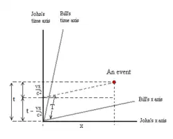 Bill and John are moving at a relative velocity, v, and synchronise clocks when they pass each other. Both Bill and John observe an event along Bill's direction of motion. What times will Bill and John assign to the event? It was shown above that the relativistic phase was given by: . This means that Bill will observe an extra amount of time elapsing on John's time axis due to the position of the event. Taking phase into account and using the time dilation equation Bill is going to observe that the amount of time his own clocks measure can be compared with John's clocks using: