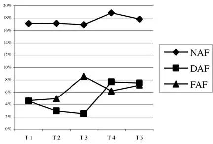 Stuttering (left scale) while reading five text passages (bottom scale), in women. About 17% of words were stuttered without the device (NAF). Stuttered words with DAF or FAF varied between 2% and 8%.