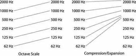 But some FAF devices don’t have enough processing power to produce octave-scale FAF. Instead, a simpler process uses frequency compression/expansion FAF. The upshift adds 500 Hz to your voice (or 1000 Hz or 2000 Hz, depending on the setting). Thus, your 125 Hz fundamental frequency is shifted to 625 Hz, or more than two octaves up. Your 250 Hz first overtone is shifted to 750 Hz. Your 500 Hz second overtone is shifted to 1000 Hz.