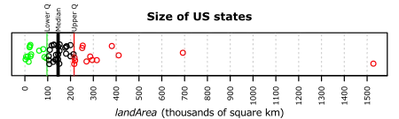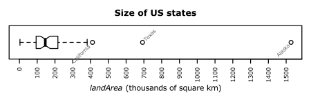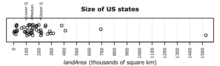 Figure 2.3(d) is a more sophisticated boxplot of the same data. Here, notches have been drawn on the box: these are useful for comparing the medians in different boxplots. The whiskers have been shortened so that they do not include points considered as outliers. There are various ways of defining these outliers automatically. This figure is based on a convention that considers outlying points as those more than one and a half times the IQR from either side of the box. However it is often more informative to identify and inspect interesting points (including outliers) by visual inspection. For example, in Figure 2.1a it is clear that Alaska and (to a lesser extent) Texas are unusually large states, but that California (identified as an outlier by this automatic procedure) is not so set-apart from the rest.