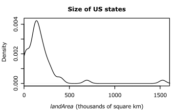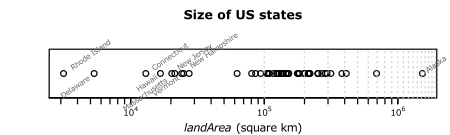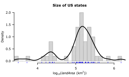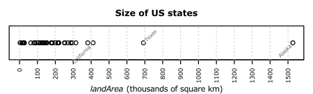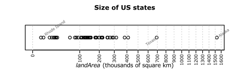 Sometimes, plotting on a different scale (e.g. a logarithmic scale) can be more informative. We can visualise this either as a plot with a non-linear (e.g. logarithmic) axis, or as a conventional plot of a transformed variable (e.g. a plot of log(my.variable) on a standard, linear axis). Figure 2.1(b) illustrates this point: the left axis marks the state areas, the right axis marks the logarithm of the state areas. This sort of rescaling can highlight quite different features of a variable. In this case, it seems clear that there are a batch of nine states which seem distinctly smaller than most, and while Alaska still seems extraordinarily large, Texas does not seem so unusual in that respect. This is also reflected by the automatic labelling of outliers in the log-transformed variable.