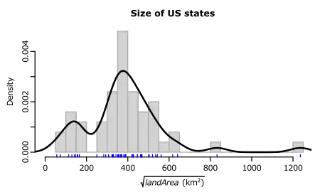 There are other common transformations, for example, the square-root transformation (often used for count data). This may be more appropriate for state areas, if the limiting factor for state size is (e.g.) the distance across the state, or factors associated with it (e.g. the length of time to cross from one side to another). Figure 2.1c shows a sqrt rescaling of the data. You can see that in some sense this is less extreme than the log transformation...
