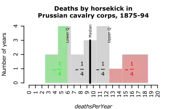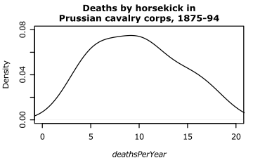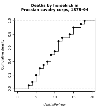 11. This dataset was collected by the Russian economist von Bortkiewicz, in 1898, to illustrate the pattern seen when events occur independently of each other (this is known as a Poisson distribution). The table here gives the total number of deaths summed over all 14 corps. For the full dataset, broken down into corp, see Statistical Analysis: an Introduction using R/Datasets
