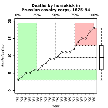 We can space out the points along the other axis. For example, if the order of points in the dataset is meaningful, we can just plot each point in turn. This is true for whatsit's horse-kick data. The data by year are plotted in Figure 2.6.