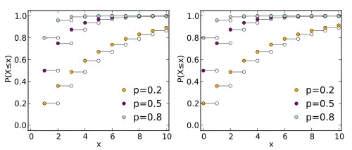 - The probability distribution of the number Y = X − 1 of failures before the first success, supported on the set { 0, 1, 2, 3, ... }