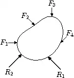 The images on the right show a body which is acted upon by external forces , , etc. The supports provide reaction forces (, ) so that the body is stationary.