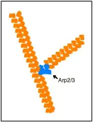 Actin is a protein complex that forms the majority of a cell’s cytoskeleton. The globular portions of action (G-actin) are bound together in the long, thin microfilaments of F-actin. The F-actin microfilaments are double-stranded in a double helix formation. It is the actin-related protein (Arp2/3) complex that facilitates a process called nucleation, which is the formation of a new actin microfilament branch. The daughter filament stems from the parent filament in a y-shape at an expected angle of about 70 degrees. Actin has been observed to have many different functions like muscle contraction, maintaining cell shape, mobility of the cell, division of the cell and also in cell signaling. The function of interest here is the role of actin in the many steps of endocytosis.