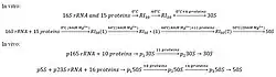 Like the in vitro assembly mechanism, the in vivo assembly of the 30S subunit has two intermediates (p130S and p230S) and the 50S subunit has three intermediates (p150S, p250S, and p350S). However, the reconstitution intermediates are not the same as in vitro. The intermediates of the 30S subunit yield 21S and 30S particles while the intermediates of the 50S subunit yield 32S, 43S, and 50S particles. The intermediates in the in vivo assembly are precursor rRNA which is different from in vitro which uses matured rRNA. To complete the mechanism of ribosome assembly, these precursor rRNA gets transformed in the polysomes.