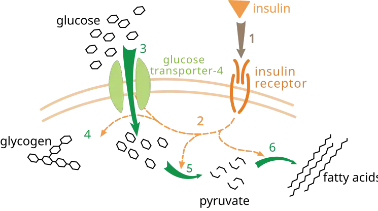 Insulin binds to a-subunit and changes the conformation causing autophosphorylation of tyrosine residues. Those residues are then picked up by phosphotyrosine-binding domains known as PTB, such as insulin receptor substrate, SHC and Cbl. Activated receptors phosphorylate tyrosine residues on the receptors. These receptors interact by signaling molecules through their SH2 domains and activates many other pathways such as PI 3-kinase signaling, MAPK activation and Cbl/CAP complex activation. Regulation of glucose, lipids and protein metabolism are the results of these pathways.