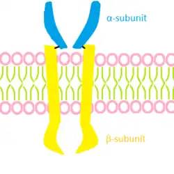 The receptor of insulin is a dimer of two identical subunits that spans the cell membrane. Each of the two subunits is made of one α-chain and one β-chain, connected together by a single disulfide bond. The α-chain lies on the exterior of the cell membrane, while the β-chain spans the cell membrane in a single segment, and with the exception of this segment lies on the inside of the cell membrane.[1]