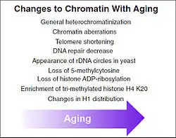 A common feature of aging is random cell-to-cell variation in gene expression. Also, differences in the expression of chromatin modifiers have been found throughout senescence and aging. This changes the distribution and levels of chromatin modifications throughout the nucleus and at aging-associated loci, leading to the activation of age-promoting physiological responses.
