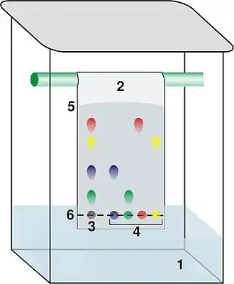 A light pencil line is drawn approximately 7 mm from the bottom of the plate and a small drop of a solution of the dye mixture is placed along the line. To show the original position of the drop, the line must be drawn in pencil. If it was drawn in ink, dyes from the ink would move up the TLC plate along with the dye mixture and the results would not be accurate. In order to get more accurate results, dot the TLC paper with the dye mixture a few times trying to build up material without widening the spots. A spot with a diameter of 1 mm will give good results. While dotting the TLC plate, be sure to not dot mixtures too close to one another because when the dye mixture rises up the TLC plate, it will clash with the other spots and the Rf values will be difficult to calculate.