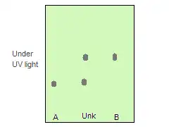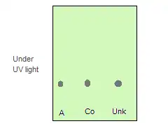 2. If there is only one dark spot for the unknown and it is uncertain whether the spot for compound A is at the same level as the spot for the unknown, one can co-spot both compounds on the TLC plate for a quick check. Co-spot means to spot compound A on one area of the TLC plate and spot the unknown on the same area as the spot of compound A. If there is only one dark spot under the UV light for the co-spotting lane, the identity of unknown is A.