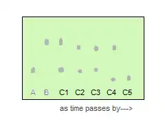 Two spots on C1 align with A and B suggests just a mixture of A+B, not a new product. C2 and C3 still have one spot aligning with reactant A, but C4 has both spots that do not match with either reactant, where C5 only has one dark spot. There are two possible interpretations: