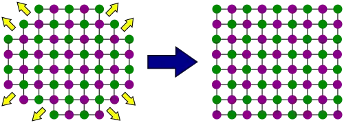 The flat faces (also called facets) of a euhedral crystal are oriented in a specific way relative to the underlying atomic arrangement of the crystal: They are planes of relatively low Miller index.[1] This occurs because some surface orientations are more stable than others (lower surface energy). As a crystal grows, new atoms attach easily to the rougher and less stable parts of the surface, but less easily to the flat, stable surfaces. Therefore, the flat surfaces tend to grow larger and smoother, until the whole crystal surface consists of these plane surfaces. (See diagram on right.)