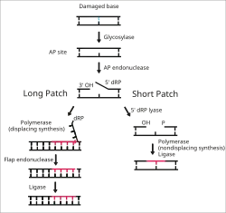 The first step in base-excision repair is the excision of modified nucleotide. Enzymes called DNA glycosylases, each has its own ability to recognize certain type of modified bases, cleave the bond between the 1'-carbon of the deoxyribose sugar and the base and remove the base. Then enzyme called apurinic or apyrimidinic (AP) endonuclease breaks the phosphodiester bond and another enzyme removes the deoxyribose sugar. DNA polymerase comes and adds the correct nucleotide to a free 3'OH group. Finally, DNA ligase connects the DNA strand by forming phosphodiester bond.
