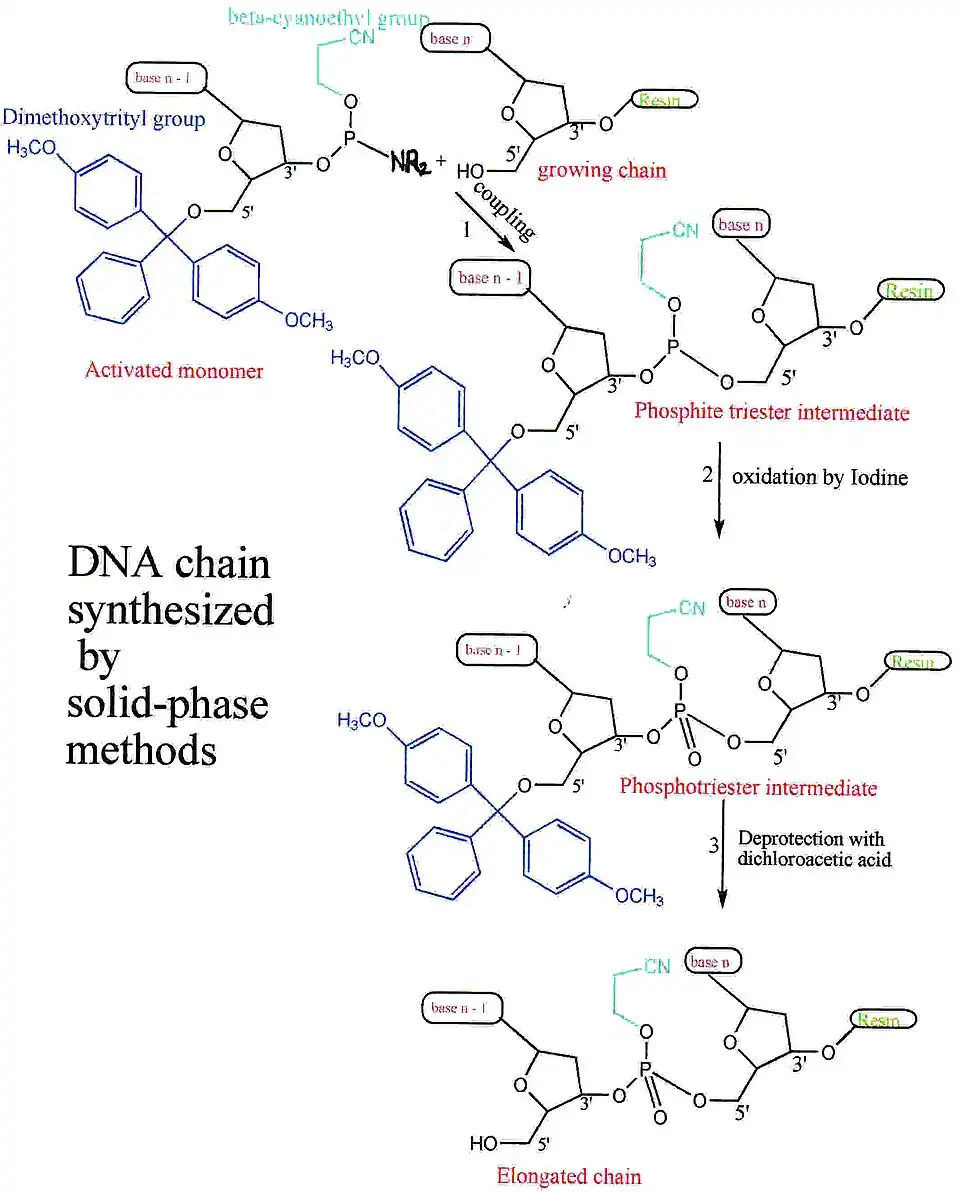 DNA can be synthesized by automated solid-phase technique, just like the synthesize polypeptides. A monomer is attached to a insoluble column, then activated monomers are added in the order of the sequence interested to form an oligonucleotide. The activated monomers are deoxyribonucleoside 3'-phosphoramidites. The meaning of activated is that the reactive group, hydroxyl group on the fifth carbon (5') is replaced by DMT, dimethoxytrityl. It keeps the deoxyribonucleoside 3'-phospohramidite molecule away from any further reaction on 5'. Thus, it was said to be a protecting group. The 3'-phosphoryl group is protected by a β-cyanoethyl (βCE) group. Since it is the 3'-phosphoryl group that is attached to the insoluble support, the chain is synthesized in 3' to 5'* direction. The synthesize of oligonucleotide consist three basic steps.