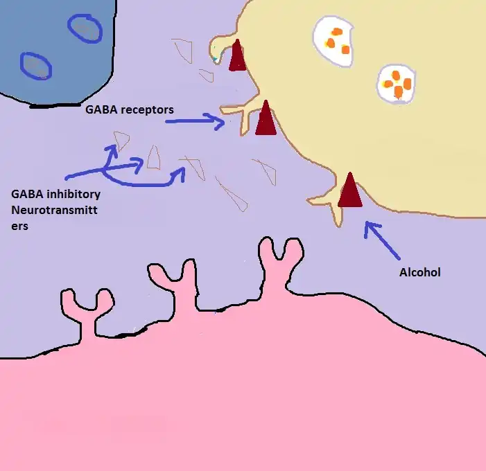 3) Alcohol delivers sedative punch once it goes into the brain. It interacts with GABA receptors and drives them to be more inhibitory. Then, it binds to the glutamate receptors and inhibits glutamate neurotransmitters from binding to their receptor. As a result, the cell is inhibited from being excited.
