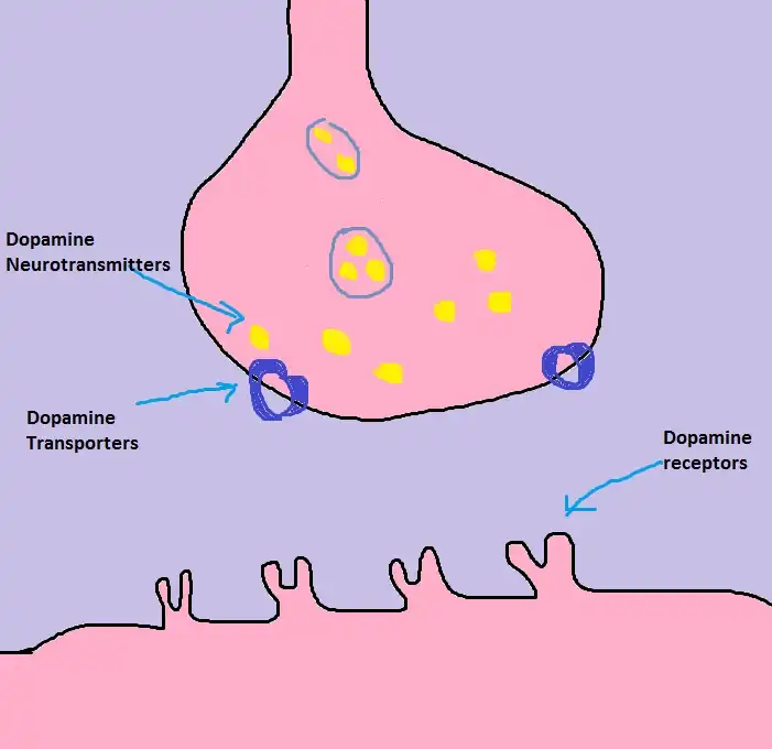 1) Dopamine is taken out of the synaptic cleft by the dopamine transporting molecules after dopamine is done with its job.