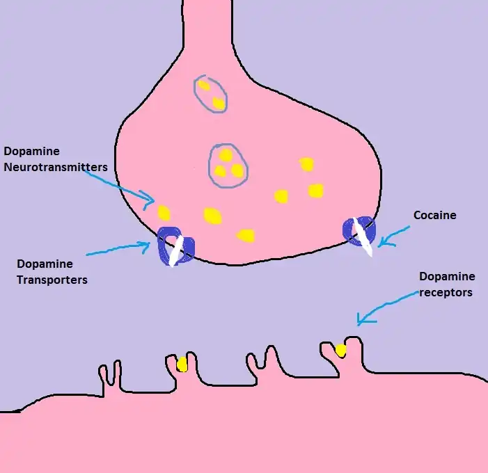 2) What cocaine does is blocking the transporters, making dopamine stuck in the synaptic cleft. As a result, dopamine binds to the receptors over and over and that causes overstimulation in the cell.