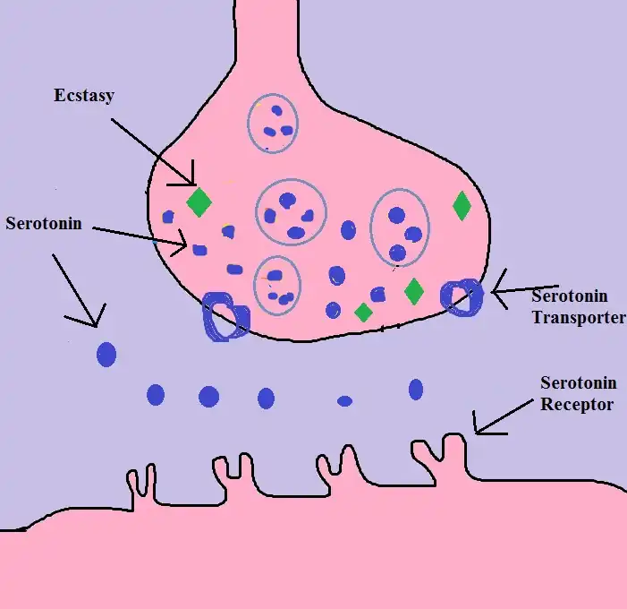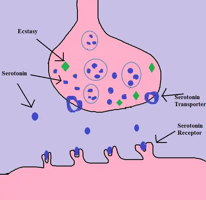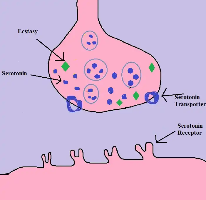 3) The interaction of serotonin transporters with ecstasy confuses the transporters in a way that they start pumping serotonin out of the cell into the synaptic cleft.