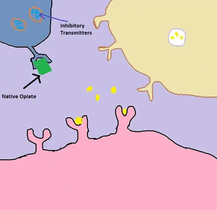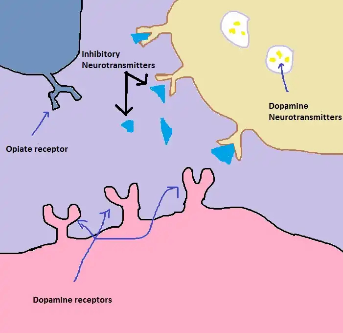 2) When natural opioid that are produced by the body (endogenous opioids) activate opioid receptors, inhibitory transmitters release is shut down. When there is no inhibition, dopamine is released and it binds to dopamine receptors.