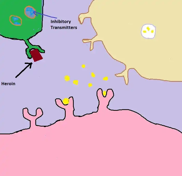 3) When heroin enters the system, it binds to the opioid receptors because it has the same shape as endogenous opioids. This mechanism turns off dopamine inhibition and dopamine gets released into the synapse. This in turn generates feelings of sedation and well-being.