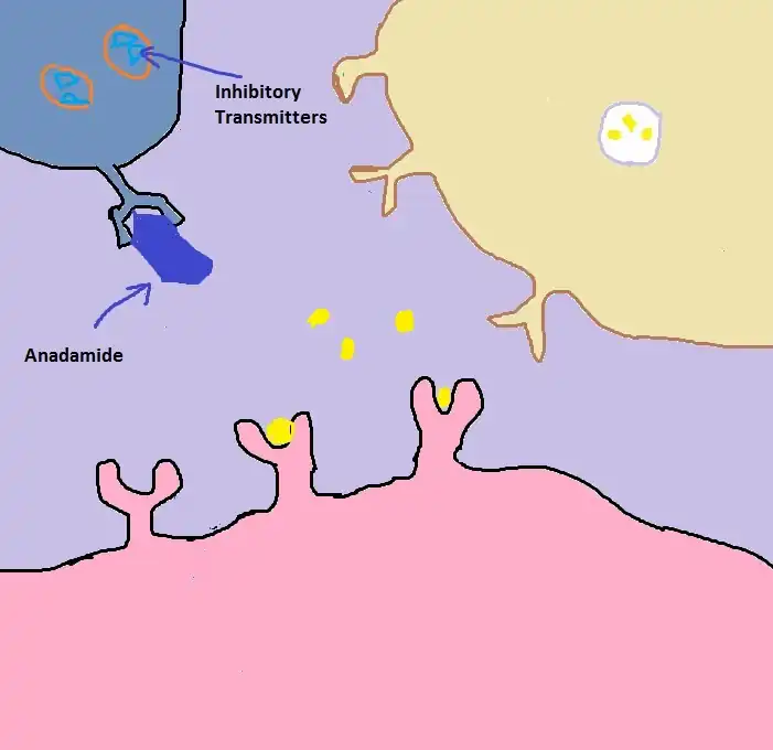 3)THC, the active chemical in marijuana, mimics anandamide and binds to cannabinoid receptors. The inhibition is shut off and dopamine starts to exit into the synapse.