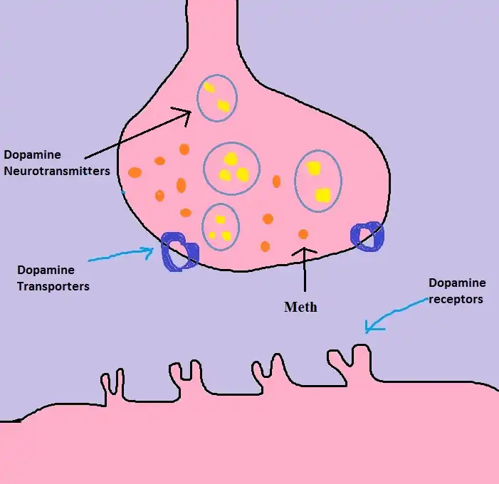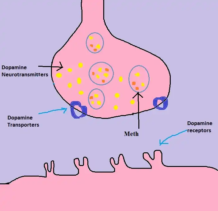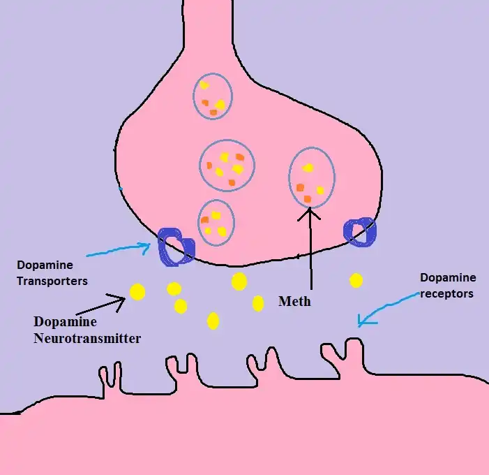 2) When meth is transported to the inside of the cell, it enters the vesicle that carries dopamine and forces the dopamine out of the vesicle.