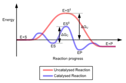 The enzyme function and catalysis result from the ability to stabilize the transition state in a chemical reaction. The transition state is the highest energy species in a reaction. It is a transitory molecular structure that is no longer the substrate but is not yet the product. It is the most seldom occupied species along the reaction pathway. The difference in free energy between the transition state and the substrate is called the Gibbs free energy of activation or simply the activation energy.