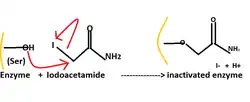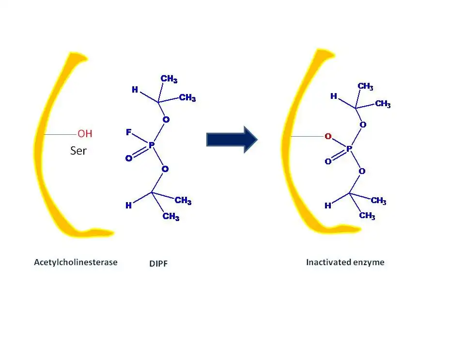 - Group specific reagents react with specific amino acid side chains like diisopropylphosphofluoridate (DIPF) and iodoacetamide. For example, only 1 of the 28 serine residues in chymotrypsin is modified by DIPF. This means that this specific residue is especially reactive; moreover, it is implied that this specific residue lies in the active site of the enzyme chymotrypsin. DIPF has also provided data that suggests, through its binding with active serine residues, that there is indeed a reactive serine residue contained within the active site of the enzyme Acetylcholinesterase. The inactivating functionality of DIPF and similarly-shaped molecules in acetylcholinesterase is representative of a group of compounds, known as nerve agents.