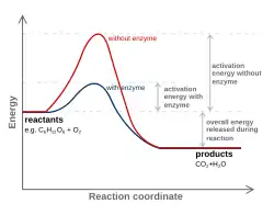 Enzymes are usually proteins that act like catalysts. The enzyme's ability to make the reaction faster depends on the fact that it stabilizes the transition state. The transition state's energy or, in terms of a reaction, the activation energy is the minimum energy that is needed to break certain bonds of the reactants so as to turn them into products. Enzymes decreases activation energy by shaping its active site such that it fits the transition state even better than the substrate. When the substrate binds, the enzyme may stretch or distort a key bond and weaken it so that less activation energy is needed to break the bond at the start of the reaction. In many cases, the transition state of a reaction has a different geometry at the key atom (for instance, tetrahedral instead of trigonal planar). By optimizing binding of a tetrahedral atom, the substrate is helped on its way to the transition state and therefore lowers the activation energy, allowing more molecules to be able to turn into products in a given period of time. The enzyme stabilizes the transition state through various ways. Some ways an enzyme stabilizes is to have an environment that is the opposite charge of the transition state, providing a different pathway, and making it easier for the reactants to be in the right orientation for reaction.