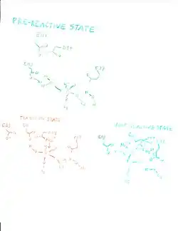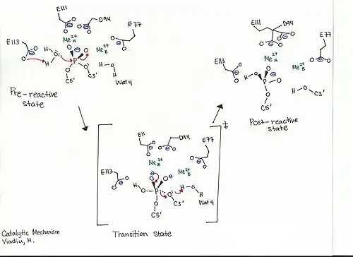 BamHI is a catalysis mechanism that involves three different states. The first state, which is before the reaction occurs, is called the pre-reactive state. Next it's the intermediate state, known as the transition state. The last state is the post-reactive state. The following are the steps that of how the mechanism occurs: There is a water molecule and a glutamic acid present. This allows the glutamic acid to take a proton of water and extract the proton. This leaves a hydroxyl group which will have a nucleophilic attack on the phosphate atom. Since there are two metals, the negative charges get stabilized. Then, there will be a pentavalent phosphate, and the extra negative charge are stabilize by the metal ions. The phosphate will have an extra oxygen which causes the water in the solution to behave as a donor. This allows the tendency of phosphate to recover its coordination. Finally, the oxygen will attack the water molecule and the proton will go to the leaving group, resulting to the post-reactive state. Overall, when comparing the pre-reactive and post-reactive states, the slight movement phosphate is observed.