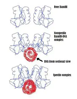 BamHI is able to recognize particular sequences of DNA in a pool of millions of possible sequences by simply binding the any DNA. Then, they slide along the DNA strand to find the right sequence. When it finds the particular sequence, it will change conformation and embrace the DNA.