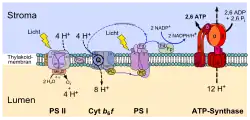 The photosystems undergo in the internal membrane called Thylakoid membrane. Thylakoid membrane is membrane full of collections of pigments and proteins. There are four types of pigments they are: chlorophylls, carotenes, xanthophylls and phycobilins. The light reaction uses the light power to create ATP and NADPH2 to provide reducing energy to undergo the chemical reaction to reduce the CO2 to sugar. [2]